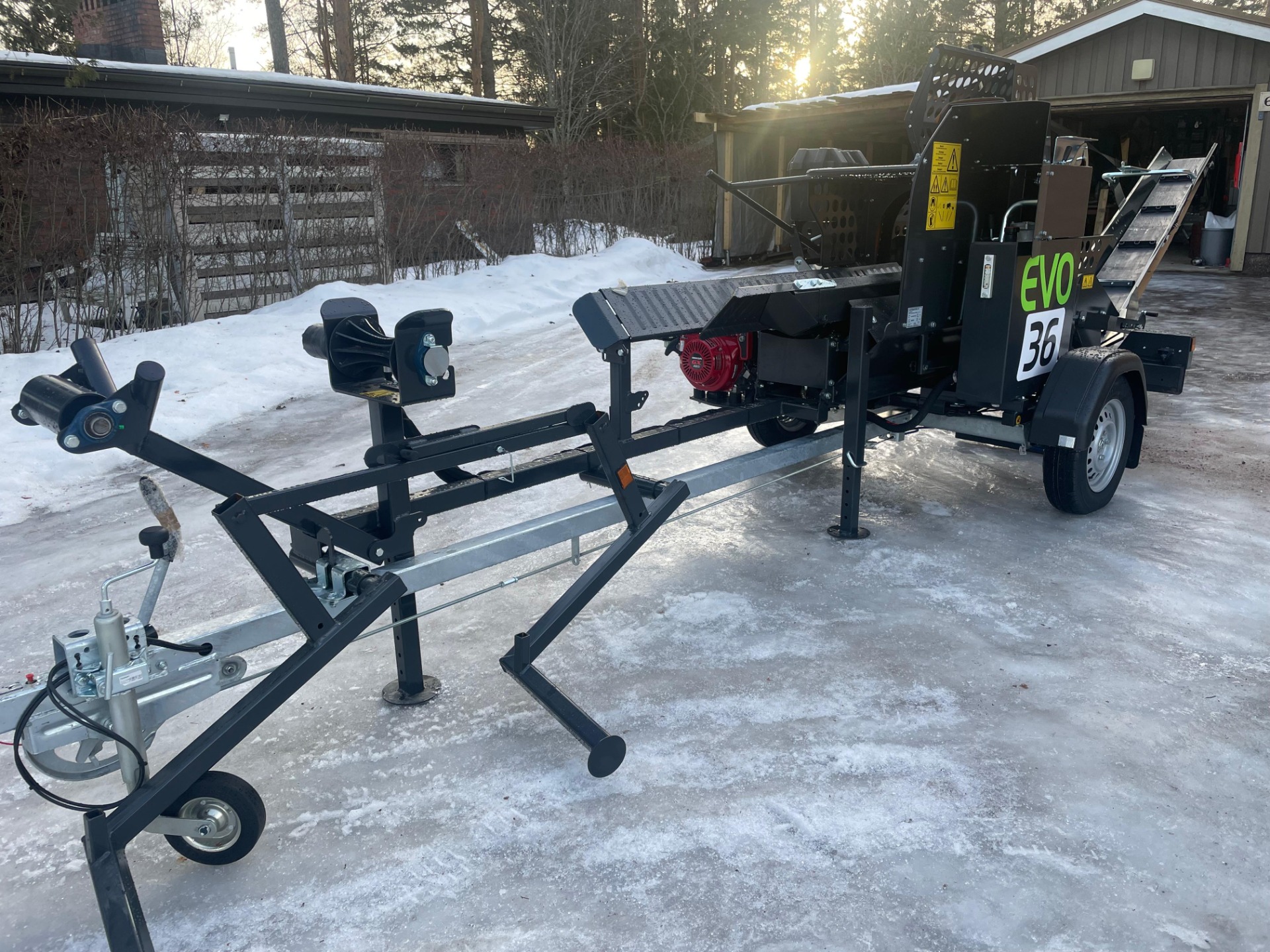 Pilkemaster Evo 36 Mobiili on auton perässä vedettävä klapikone jarrullisella alustalla. Kone pätkii ja halkaisee puut 2, 4 tai 6 osaan. Kokonaisuudessaan koneesta menee läpi aina 36cm halkaisian rangat, pätkittyinä pölkkyinä isommatkin noin 40-45 cm.